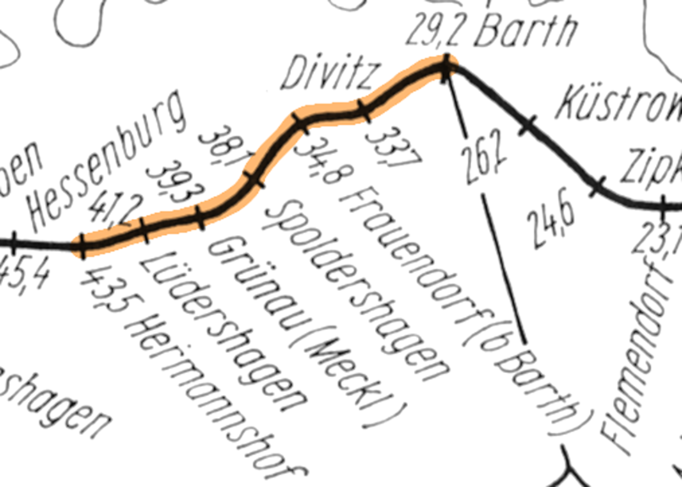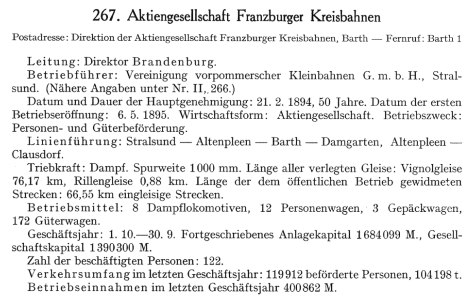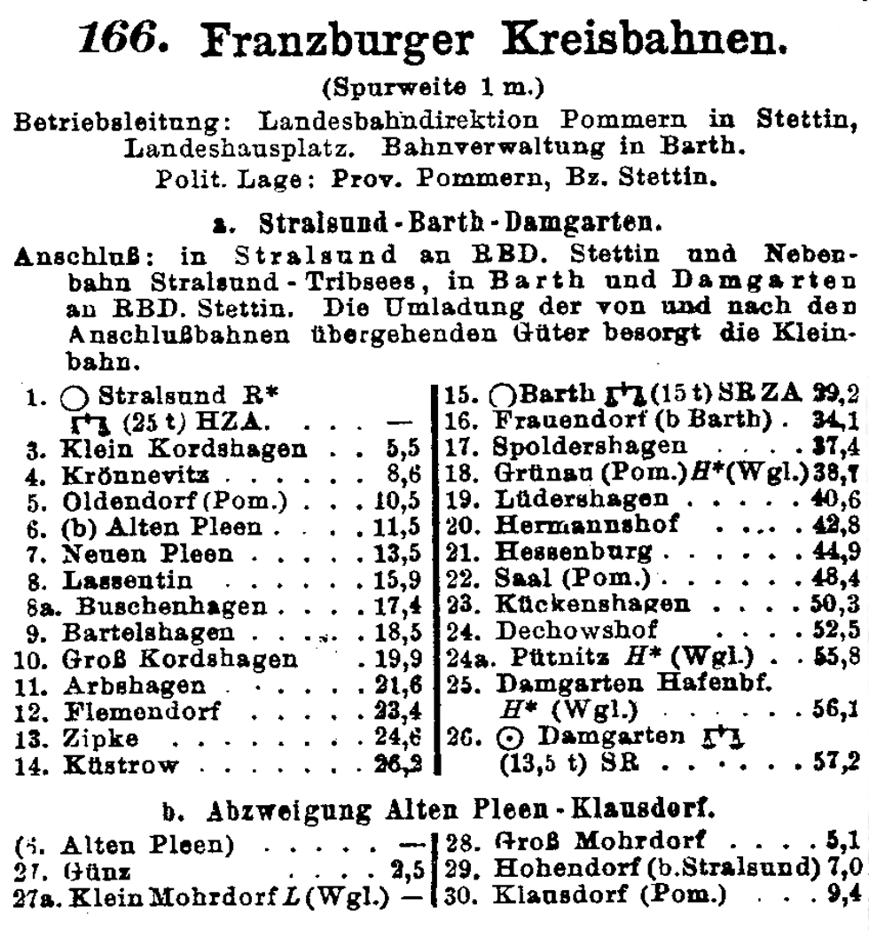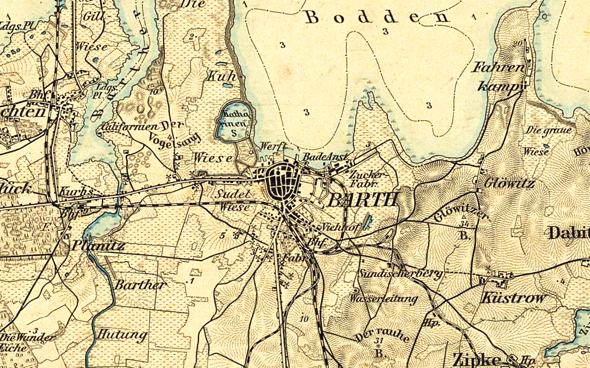 Die Stadt Barth mit ihren Eisenbahnstrecken im Jahr 1911: Zu erkennen sind u.a. Die normalspurige Strecke von Velgast nach Barth, ihre Fortsetzung als Darßbahn nach Norden zur Halbinsel Zingst, die FKB-N-Strecken nach Stralsund und Ribnitz und die Barther Hafenbahn (3-schienig 1.435/1.000 mm) Archiv: RT 8/1975