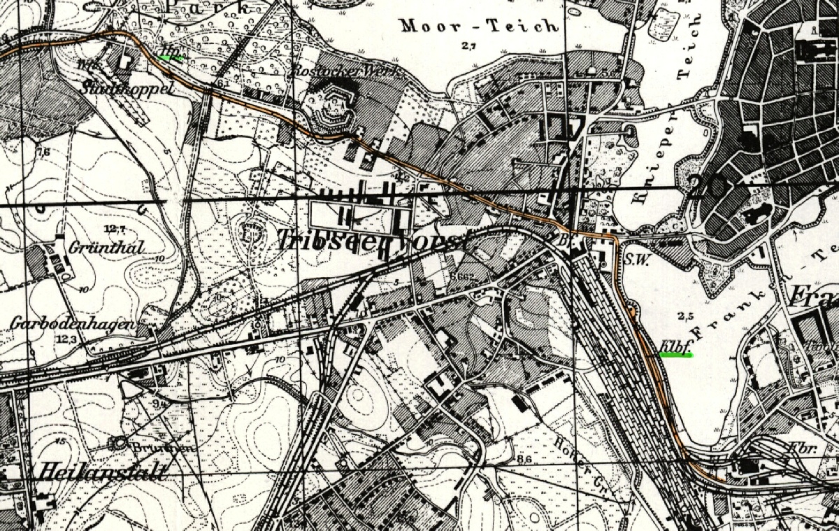 Die Stadtdurchfahrt vom Smbf. Stralsund-Ost, vorbei am Hauptbahnhof in Richung Stadtpark (mit Haltepunkt) und wweiter nach Barth (1935). FKB-N-Streckenführung ROT. Archiv R.Taege