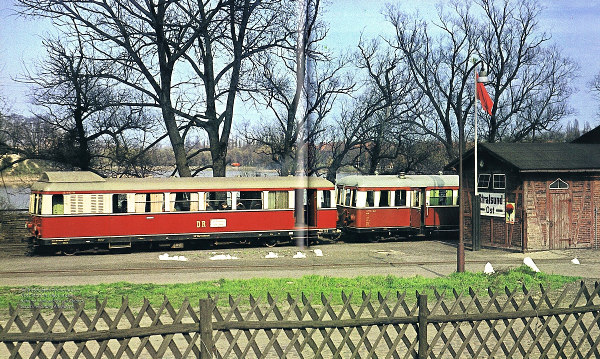 DR-Triebwagen VT 137 562 und Beiwagen VB 147 541 im Schmalspurbahnhof Stralsund-Ost, dahinter der Frankenteich. Hier beginnt sie Strecke nach Barth. Archiv R.Taege