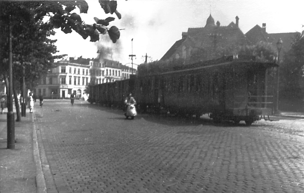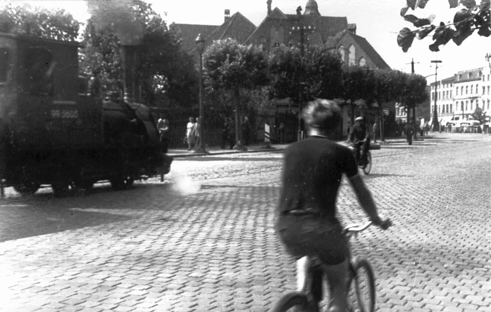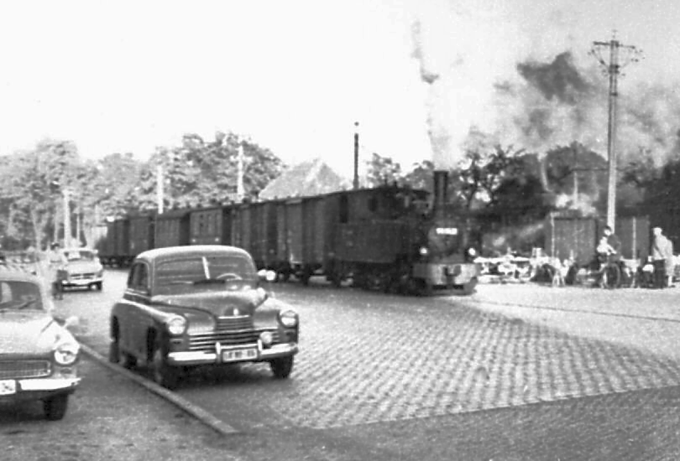 Stadtdurchfahrt eines FKB-N-Zuges von Ksbf Stralsund-Ost in Richtung Barth. DR-Lok 99 5605 als Straßenbahn vor dem Stralsunder Hauptbahnhof (1958). Foto: Günter Barthel (†) Archiv RT