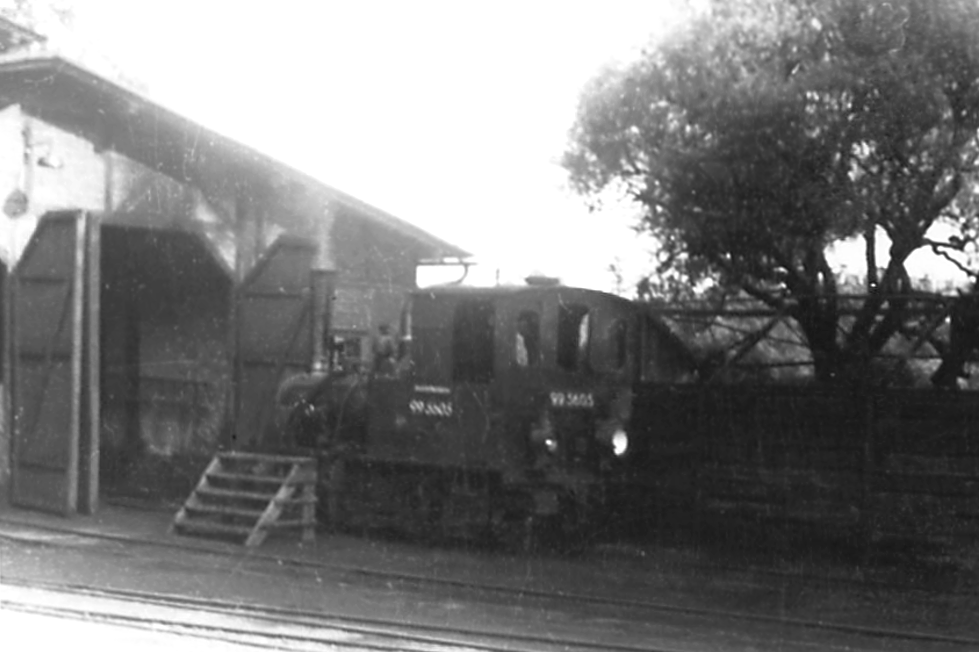 Vor dem Lokschuppen in Stralsund-Ost steht die ehemalige Lenz-Lok 6i, nun als 99 5606 bezeichnet. Foto: Günter Barthel 1958 (†) Archiv RT