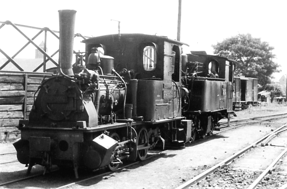 DR-Lok 99 5605 und 99 5621 kalt abgestellt nach der Betriebseinstellung im Schmalspurbahnhof Barth 1969 Foto: Klaus Kieper (†) Archiv RT