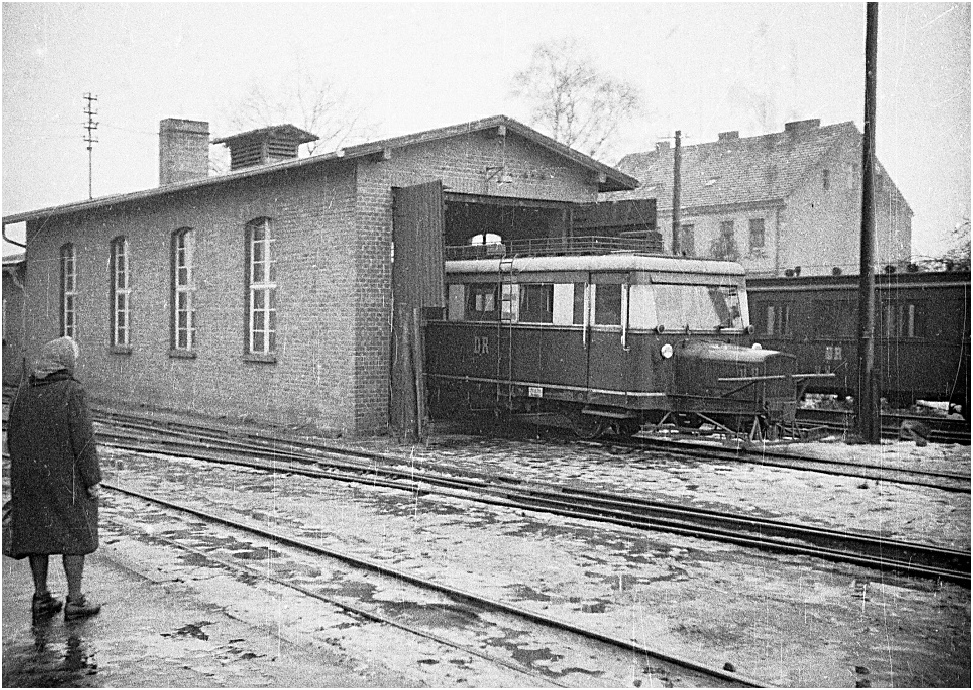 Am frühen Sonntagmorgen fährt der Wismarer Schienenbus mit der Betriebsnummer VT 133 525 aus dem Schuppen, um als planmäßiger „Personenzug“ nach Breddin an den Bahnsteig zu rangieren. Foto: RT 1/1969