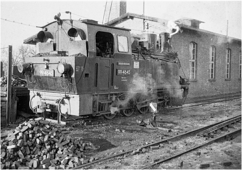 DR-Lok 99 4645 (Reko) am Kohlenbansen vor dem Lokschuppen im Klbf Kyritz. Die Maschine stammt ursprünglich von der Kleinbahn des Kreises Jerichow I bei Burg (b. Magdeburg). Nach deren Stillegung 1965 kam sie in das Raw Görlitz (Schlauroth), wurde dort umfassend modernisiert/rekonstruiert und anschließend in die Prignitz verbracht. Ihr Schicksal endet im März 1969 nach einer Entgleisung nahe Kehrberg und anschließender Verschrottung. Foto: RT 1/1969