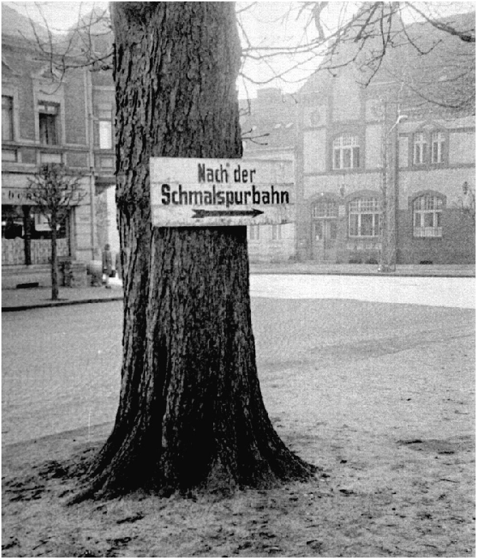 Für Reisende ohne große grammatikalische Ansprüche genügte dieses Hinweisschild an einem Baum vor dem Bahnhofsgebäude in Kyritz, um gezielt durch die Unterführung zum Kleinbahnhof zu finden.