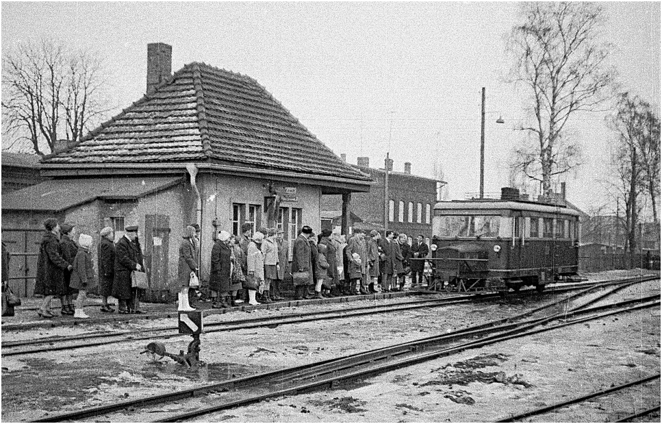 Inzwischen sind so viele Fahrgäste auf dem Bahnsteig im Klbf. Kyritz eingetroffen, dass es im VT 133 525 eng wird. Viele wollen zu ihren Verwandten auf die umliegenden Dörfer oder zum Gottesdienst in die Dorfkirche von Barenthin. Foto: RT 1/1969