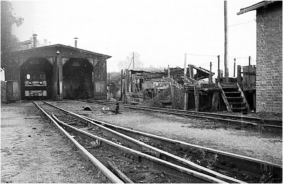 Schmalspurbahnhof Kyritz - Blick vom Bahnsteig auf den Lokschuppen mit der eingeparkten DR-Lok 99 4645 (Reko) Foto: RT 8/1968
