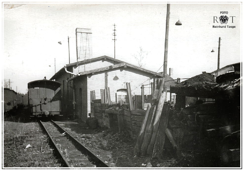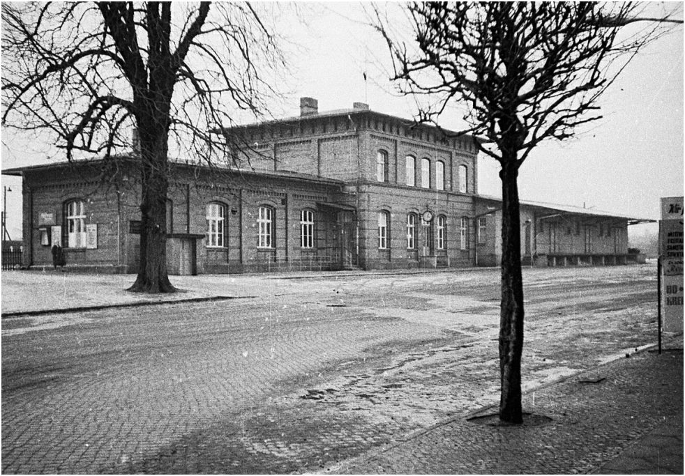 Straßenseite des Bahnhofsgebäudes der normalspurigen Prignitzer Eisenbahn-Teilstrecke Neustadt (Dosse) - Kyritz - Pritzwalk mit Gaststätte, Wartesaal und Güterschuppen Foto: RT 1/1969