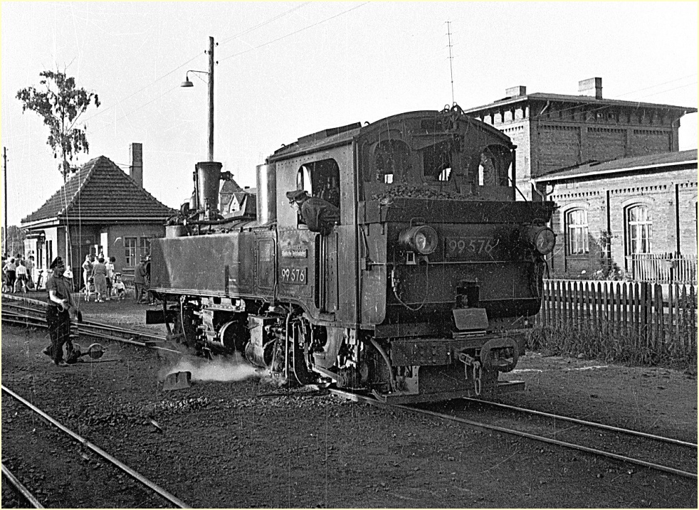 DR-Lok 99 576 Reko (sä IV K) im Smbf. Kyritz hat den Lokschuppen verlassen, um sich vor den Personenzug nach Lindenberg zu setzen. Auf dem Bahnsteig am Wartehäuschen stehen bereits zahlreiche Fahrgäste. Rechts im Bild ist das Stationsgebäude der Normalspurbahn Neustadt (Dosse) - Kyritz - Pritzwalk zu sehen. Foto: RT 8/1968