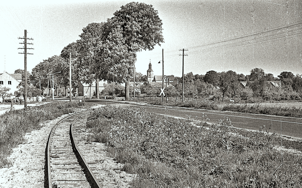 Bahnübergang mit der F 5 bei Demerthin: Damals existierte noch keine Autobahn zwischen Westberlin und Hamburg. Der Ost-/West-Straßenverkehr lief über die F 5. Da es hier keine Schranken gab, nahmen etliche Autofahrer (vor allem ausländische) die Kleinbahn nicht wahr, was zu zahlreichen Unfällen führte. Foto: RT 5/1968