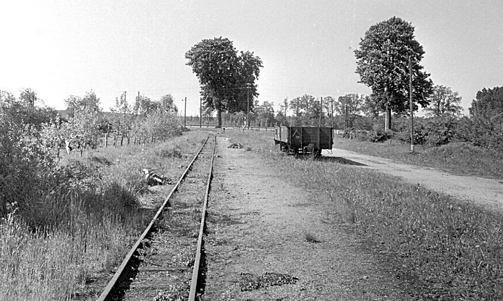 Durchgangs- und Ladegleis der Haltestelle Demerthin, Blickrichtung Lindenberg (Prign.). Im Hintergrund kreuzt das Gleis die Fernverkehrsstraße 5 (F 5, heute B 5). Auf dem Ladegleis der Oww-Wagen 97-53-72. Foto: RT 5/1968