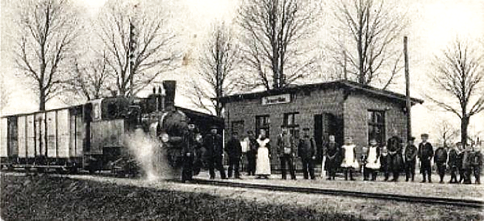 Im Dorf, in der Dorfschule und im Schloss von Demerthin hatte sich wohl herumgesprochen, das an diesem Tag des Jahres 1916 der Fotograph die Eisenbahn im „Bahnhof“ fotografieren wird. Der Zug aus Richtung Lindenberg nach Kyritz mit der Orenstein & Koppel-Lok Nr. 22 (spätere DR-Lok 99 4504) steht hierfür bereit. Zu sehen ist das ursprüngliche Stationsgebäude, dass 1935 abbrannte und durch ein Neues ersetzt wurde. Links daneben ist noch ein Nebengebäude sichtbar, dass gleich mit verschwand.