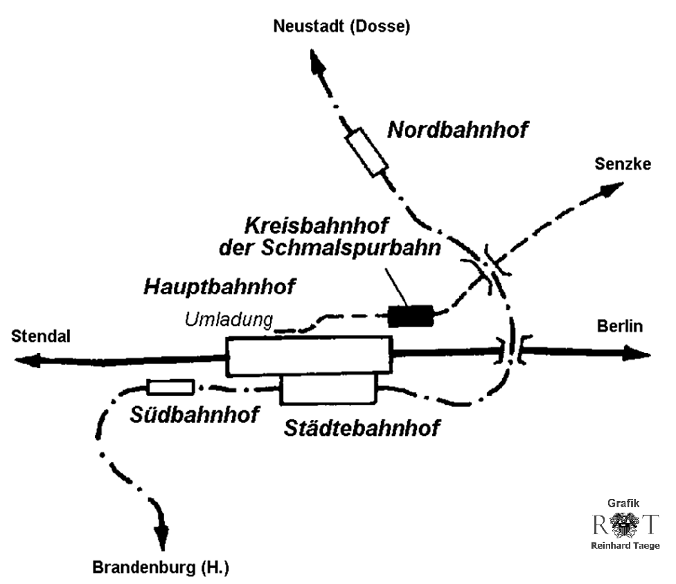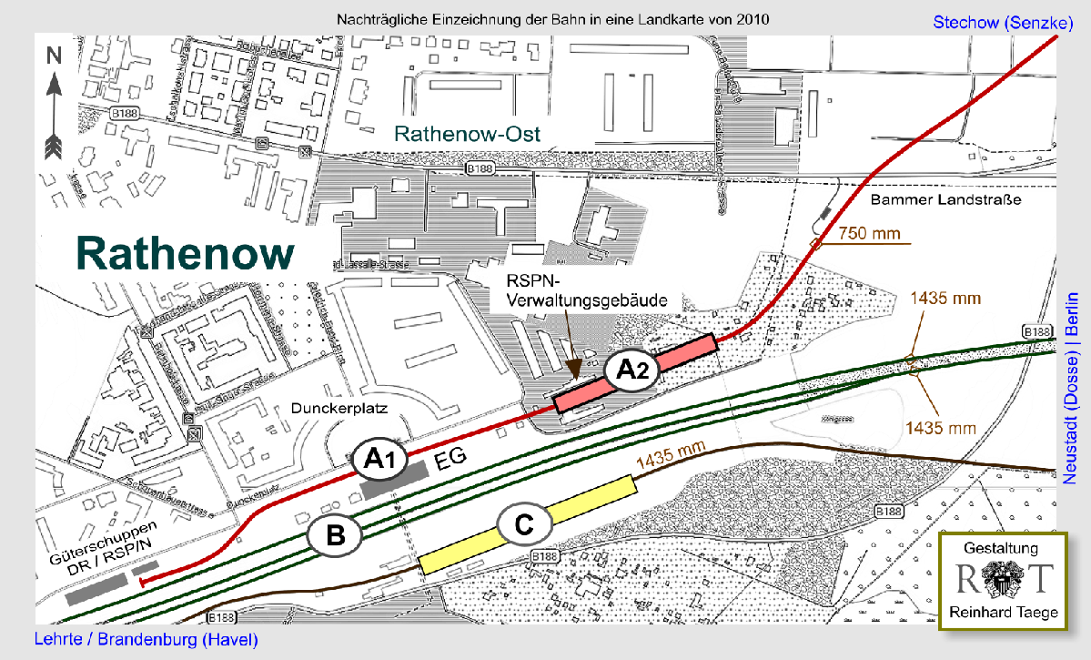 RSPN-Kreisbahnhof Rathenow (A1,A2), Hauptbahnhof der Reichsbahn (B) und Bahnhof der Brandenburgischen Städtebahn Neustadt (Dosse)-Rathenow-Brandenburg-Belzig-Treuenbrietzen (C)