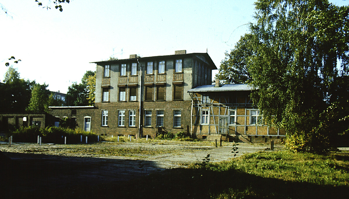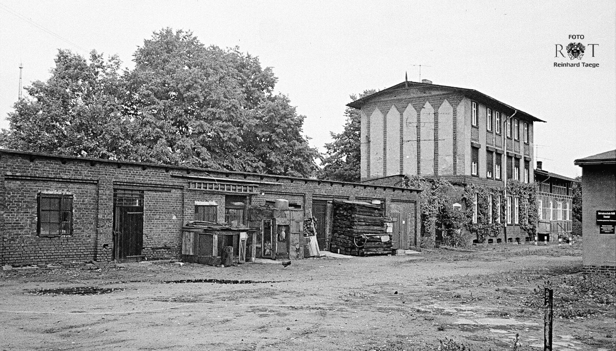 Das Verwaltungsgebäude der RSPN/RSN auf dem Gelände des ehemaligen Rathenower Kreisbahnhofs (Südseite). Links Lagerschuppen, mittleres Gebäude Paterre: Büros der Bahnverwaltung, 2./3. Stock Beamtenwohnungen, ganz hinten: Güterschuppen Foto: RT, 6/1977