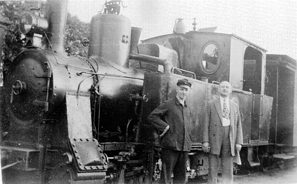 RSPN/RSN-Lok 3 (Krauss/München 1899/4113), spätere DR 99 4511, im Kreisbahnhof Rathenow. Lokführer und RSN-Betriebsleiter präsentieren sich 1934 stolz dem Fotografen. Foto: Haecker