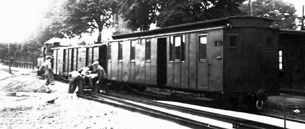 Gleiserneuerung zwischen RSN-Personenbahnsteig und Kreisbahnhof Rathenow im Zuge der Neugestaltung des Hauptbahnhof-Vorplatzes 1935. Ein regulärer Personenzug mit Kombiwagen nach Senzke passiert die Baustelle am Fahrkartenverkaufs-Kiosk (rechts im Bild) Archiv: R.Taege