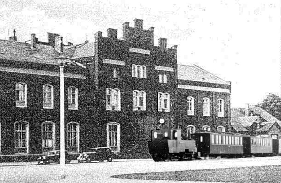 Rathenow Hauptbahnhof Dunckerplatz vor 1945: Ein Personenzug nach Senzke wartet auf dem Bahnhofsvorplatz auf Fahrgäste. Eingefaßt in Bordstein mit leicht erhöhtem Pflaster war der Bahnsteig. Der Fahrkartenverkauf erfolgte an einem Kiosk links neben dem Bahnhofsgebäude.